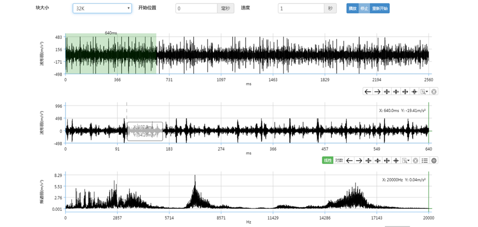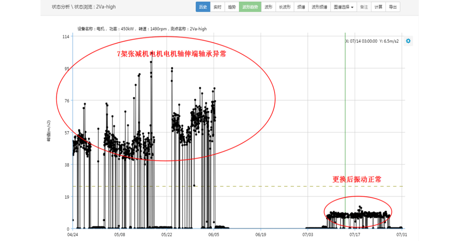 以上是7架張減機(jī)電機(jī)軸伸端加速度高頻測(cè)點(diǎn)的趨勢(shì)圖:從4月24日開始發(fā)現(xiàn)7架張減機(jī)電機(jī)軸伸端軸承內(nèi)滑道缺陷,一直監(jiān)測(cè)其劣化情況,到6月份待料檢修更換電機(jī)。更換電機(jī)后振動(dòng)正常。