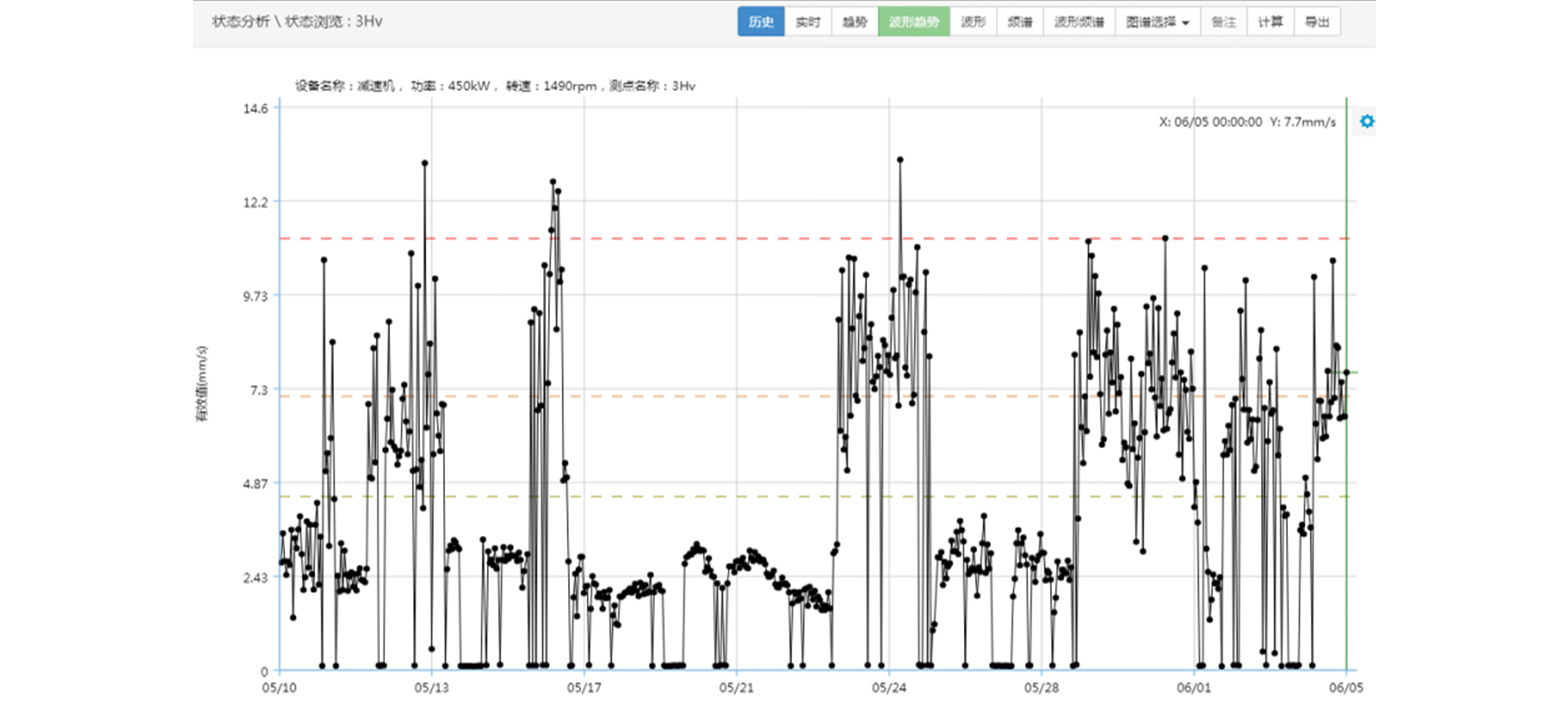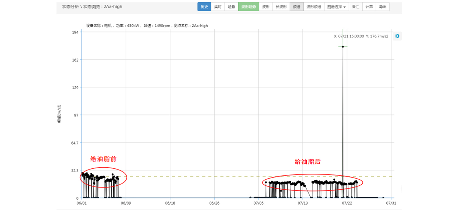 以上是9米2#3電機(jī)軸伸端6月14日16點(diǎn)高頻加速度信號(hào):升級(jí)后的傳感器頻響可以達(dá)到20KHZ,可以發(fā)現(xiàn)NU系列圓柱滾子軸承打滑現(xiàn)象,由于NU系列圓柱滾子軸承無法在軸向施加預(yù)緊力,在徑向力過小的情況下,打滑是較普遍現(xiàn)象。但也要注意給油脂情況。