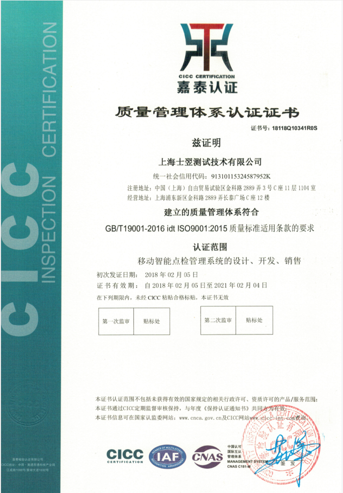 恭賀上海士翌測試技術有限公司榮獲ISO9001《質量管理體系認證證書》!