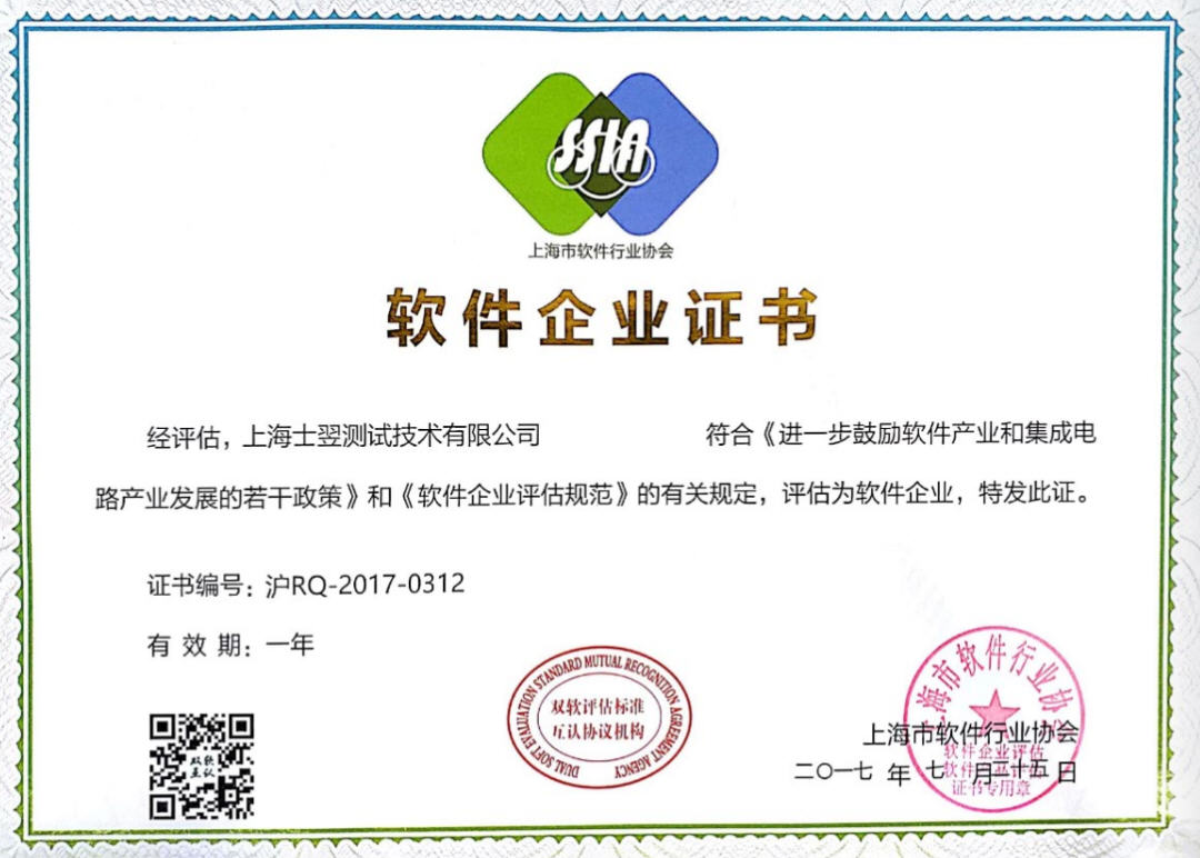 祝賀上海士翌測(cè)試技術(shù)有限公司榮獲軟件企業(yè)證書!