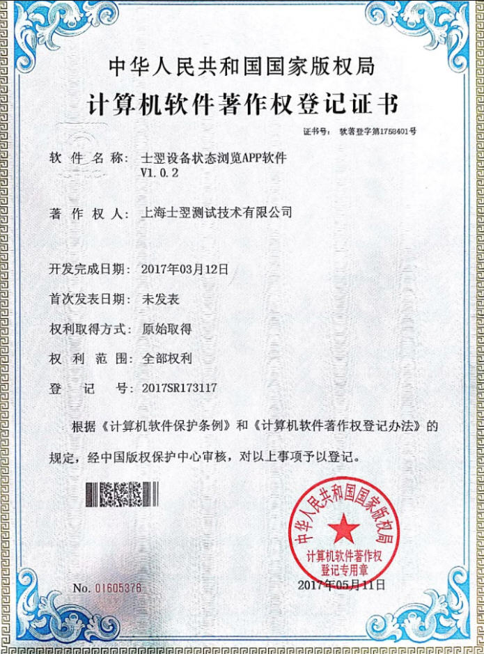 祝賀上海士翌測試技術有限公司的軟件產品士翌設備狀態(tài)瀏覽APP軟件榮獲軟件著作權登記證書!