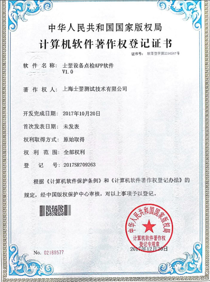 祝賀上海士翌測(cè)試技術(shù)有限公司的軟件產(chǎn)品士翌設(shè)備點(diǎn)檢APP軟件榮獲軟件著作權(quán)登記證書(shū)!