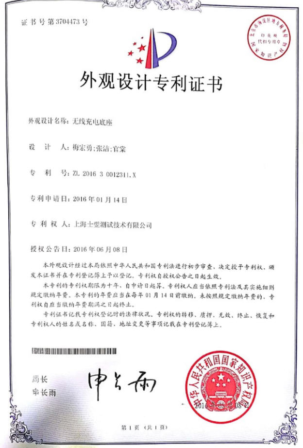 祝賀上海士翌測試技術(shù)有限公司的產(chǎn)品無線充電底座榮獲外觀設(shè)計專利證書!