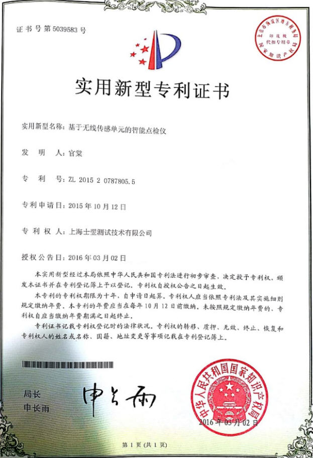 祝賀上海士翌測(cè)試技術(shù)有限公司的產(chǎn)品基于無線傳感單元的智能點(diǎn)檢儀榮獲實(shí)用新型專利證書!